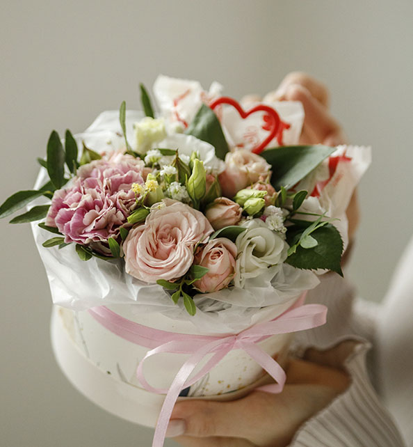 Нежная и трогательная композиция в формате цветочной коробочки, созданная для самых тёплых эмоций. Кустовая роза и эустома формируют мягкую романтичную основу букета, гвоздика добавляет объёма и бархатистой фактуры, а лёгкие веточки лимониума придают воздушность и завершённость. Особым акцентом становятся конфеты Raffaello, превращая букет в изысканный цветочно-сладкий подарок.