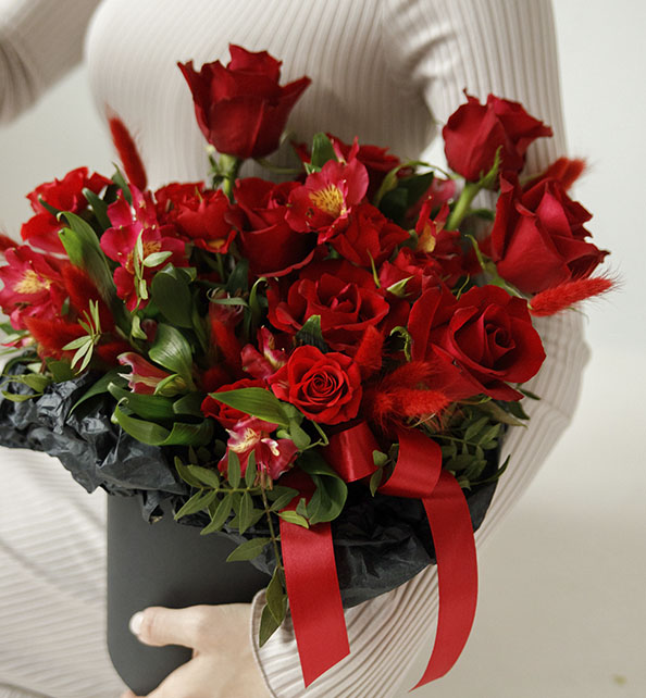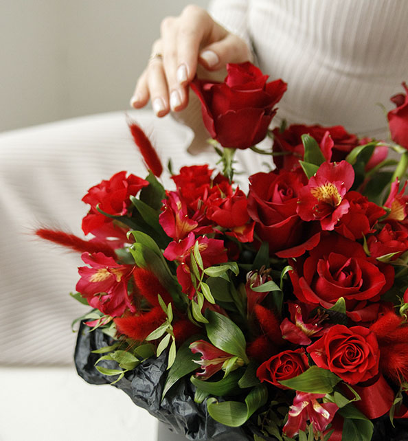 Яркий и эффектный букет в насыщенной красной гамме, наполненный энергией и страстью. Классическая роза задаёт выразительный акцент и благородство композиции, кустовая роза добавляет объёма и нежной фактуры, а альстромерия вносит лёгкость и изящные природные линии. Свежая зелень гармонично объединяет все элементы, делая букет живым, стильным и по-настоящему праздничным.