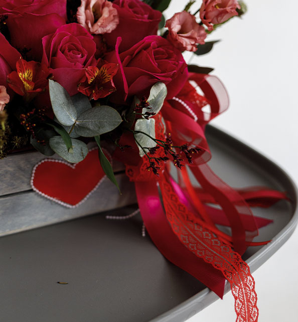 Яркая и эффектная композиция, наполненная страстью и теплом. Насыщенные розы задают выразительный тон и создают роскошный центр букета, нежная эустома и альстромерия добавляют лёгкости и утончённости. Декоративные акценты сафари, гиперикума и лимониума придают работе глубину и текстурность, делая её по-настоящему праздничной и стильной.