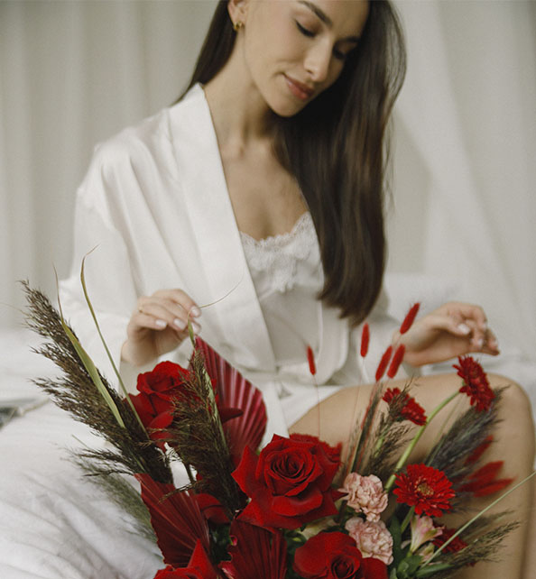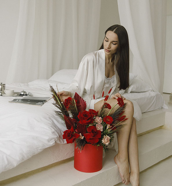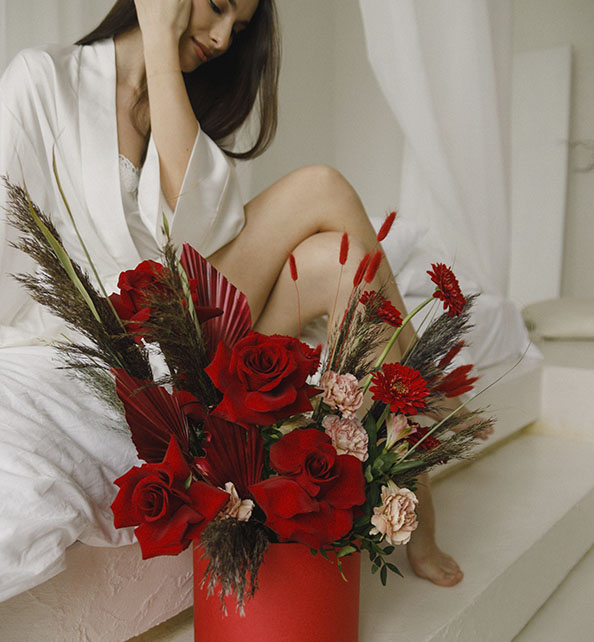 Стильная и выразительная композиция в насыщенных алых оттенках. Благородные розы создают яркий центр букета, герберы добавляют динамики и жизнерадостности, а нежные гвоздики и альстромерии вносят мягкость и гармонию. Дополненная сухоцветами и декоративной зеленью, композиция выглядит объёмной, фактурной и очень атмосферной — идеальный акцент для интерьера или эффектный подарок.
