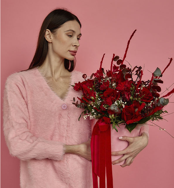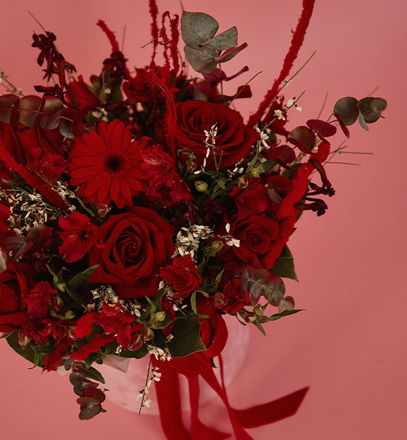 Эффектный букет в насыщенной красной гамме, наполненный энергией и страстью. Классические розы придают композиции благородство и глубину, а кустовые розы добавляют воздушность и многослойность. Яркая гербера становится выразительным акцентом, притягивая внимание своей сочностью и формой. Нежная альстромерия вносит лёгкость и динамику, а изящные веточки гинстера подчёркивают фактурность и создают ощущение природной естественности. Гармоничное сочетание оттенков и текстур делает букет стильным, выразительным и по-настоящему праздничным.