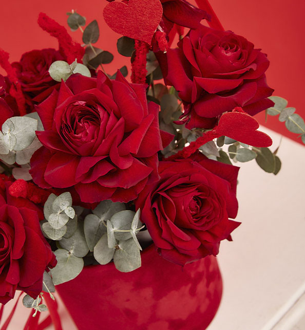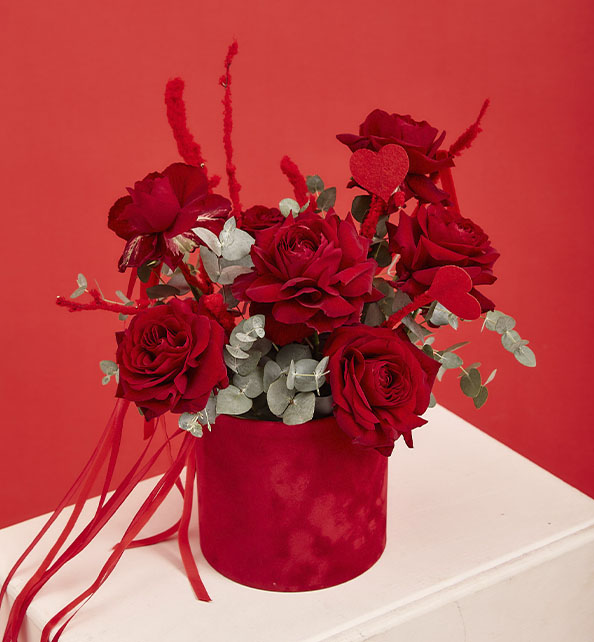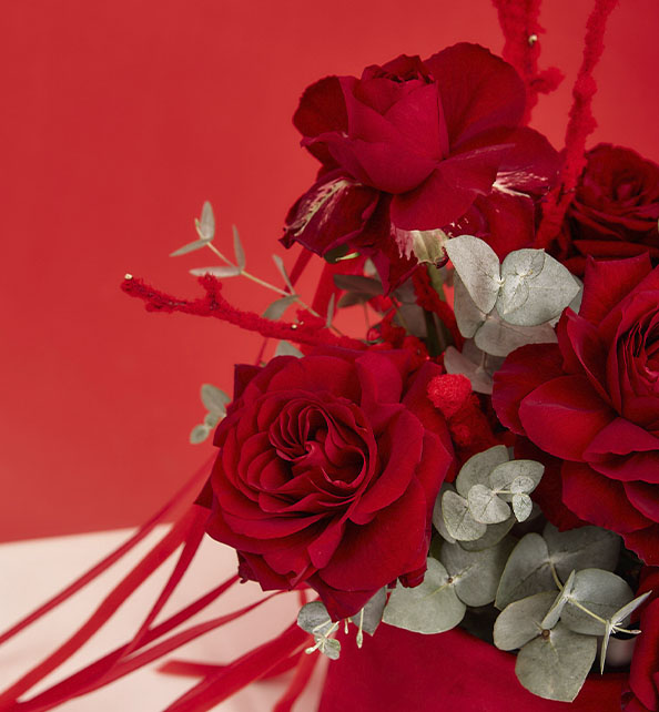 Стильная и выразительная композиция в насыщенных красных тонах, наполненная романтичным настроением. Крупные бархатные розы создают эффект роскоши и элегантности, становясь главным акцентом букета. Декоративные ветки добавляют композиции динамику, оригинальность и лёгкий праздничный характер. Свежие веточки эвкалипта вносят прохладу, воздушность и гармонично подчёркивают глубину красных оттенков. Лаконичное сочетание элементов делает композицию яркой, современной и идеально подходящей для особенного повода.
