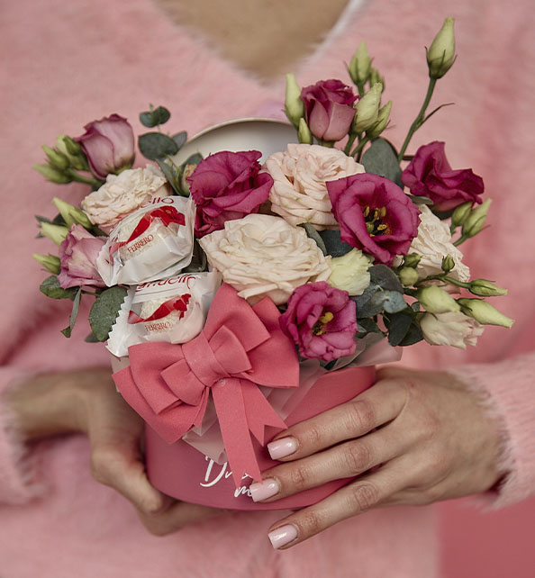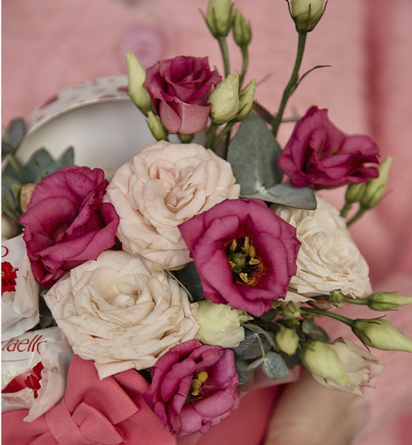 Очаровательная и нежная композиция, сочетающая в себе красоту цветов и приятный сладкий сюрприз. Изящные кустовые розы создают мягкий романтичный акцент, а утончённая эустома добавляет букету воздушности и лёгкости. Гармоничная палитра в тёплых розовых оттенках делает композицию особенно трогательной и уютной. Конфеты «Рафаэлло», аккуратно вплетённые в оформление, придают подарку оригинальность и создают атмосферу заботы и внимания. Идеальный вариант для того, чтобы порадовать близкого человека нежным и вкусным знаком внимания.