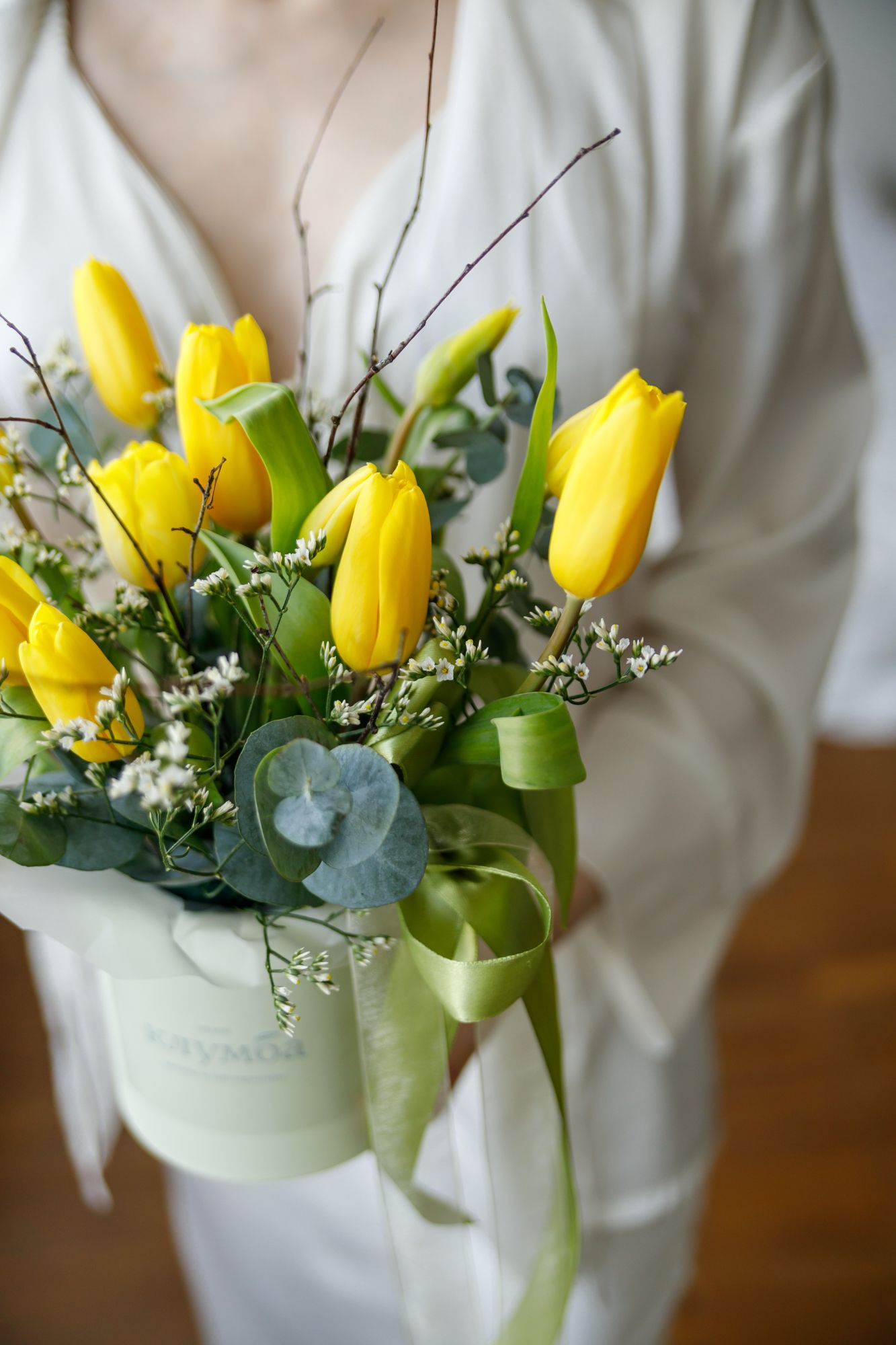 Состав: тюльпаны, лимониум, декоративная коробка или шляпная коробка.