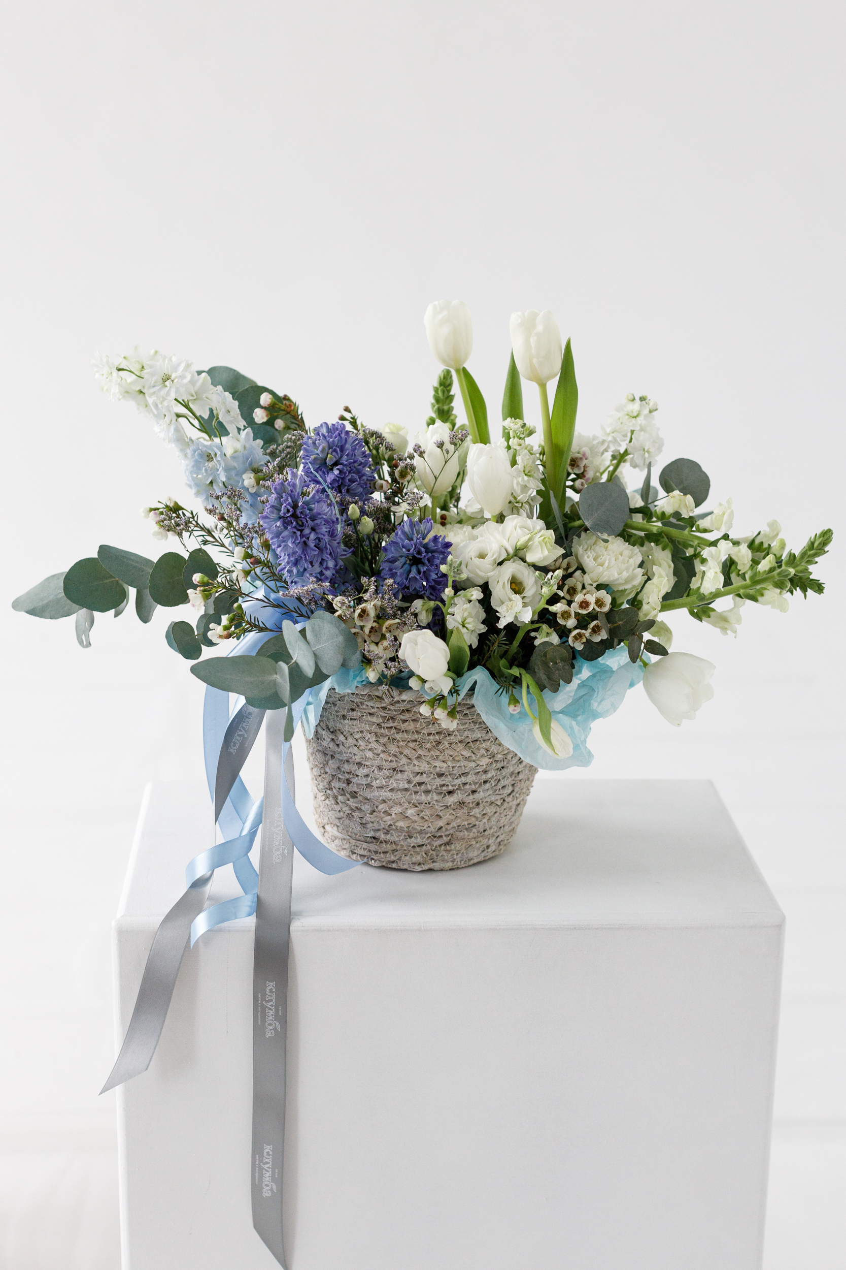 Состав: гиацинты, тюльпаны, дельфиниум, роза кустовая, воксфлауер, львиный зев, тюльпаны.