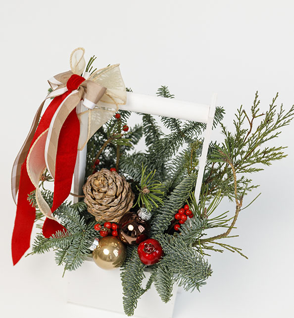 Состав композиции: хвоя, нобилис, шишки, декоративные элементы