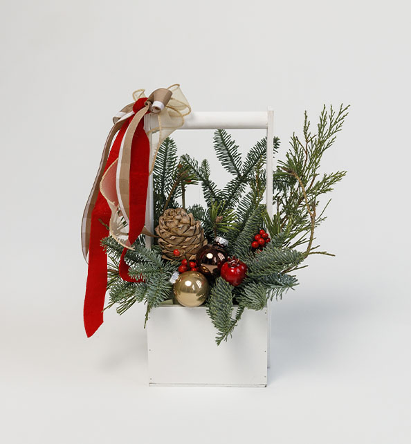 Стильная новогодняя композиция, наполненная атмосферой зимнего уюта. Густая ароматная хвоя и благородный нобилис создают пышную природную основу, а натуральные шишки и праздничные декоративные элементы придают работе особый шарм и выразительность. Элегантный акцент для интерьера и прекрасный вариант подарка к празднику.