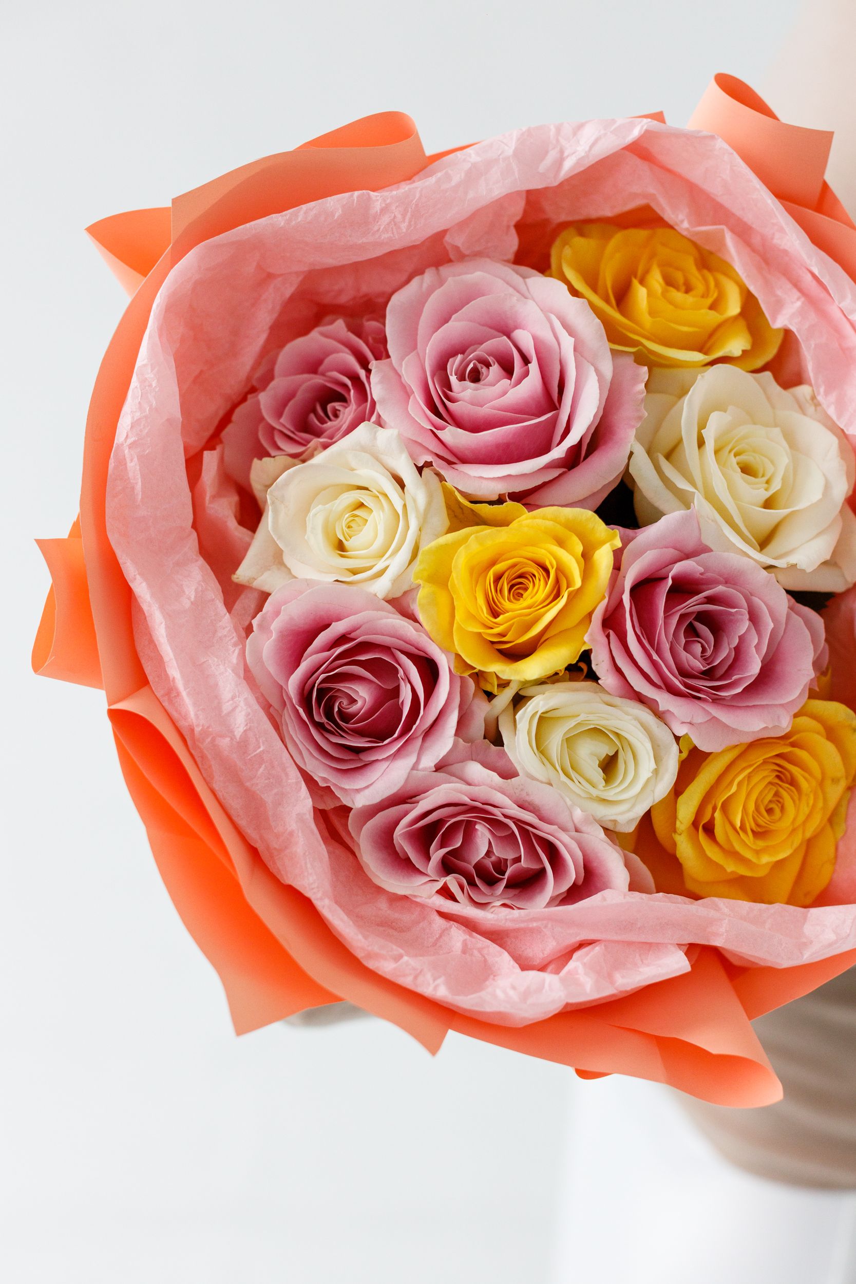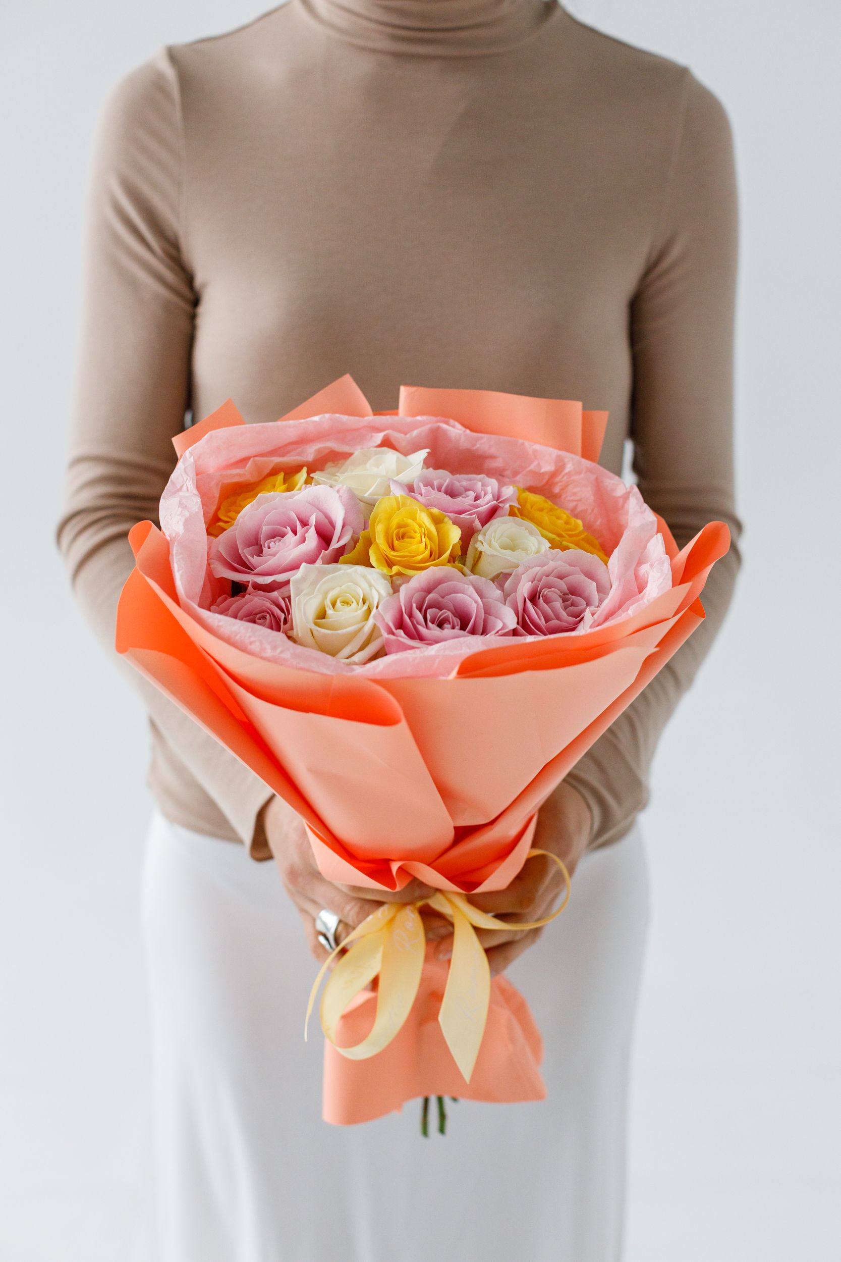 Яркий моно-букет из разноцветных роз — эффектная композиция, наполненная настроением и живыми эмоциями. Каждая роза привносит свой оттенок и характер, создавая гармоничную палитру и выразительный образ. Сочетание разных цветов придаёт букету динамику, глубину и особую индивидуальность, сохраняя при этом элегантность классической формы. Такой букет выглядит стильно и празднично, становясь универсальным подарком для радостных и значимых моментов.