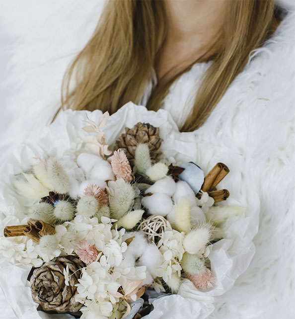 Нежная и утончённая композиция в природных светлых оттенках, наполненная теплом и уютом. Сочетание фактурных сухоцветов, мягкого хлопка и натуральных шишек создаёт гармоничный букет с особым зимним настроением. Лёгкие ноты корицы добавляют ему тонкий аромат и ощущение домашнего тепла, делая композицию идеальным подарком или стильным интерьерным акцентом.