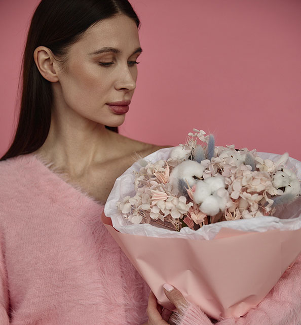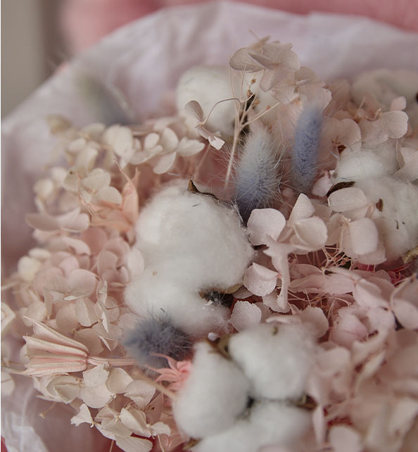 Нежная и утончённая композиция из сухоцветов в мягких пастельных тонах. Воздушные соцветия гортензии, пушистый хлопок и декоративные природные элементы создают атмосферу тепла, уюта и романтики. Такой букет долго сохраняет свою красоту, не требует ухода и станет стильным украшением интерьера или трогательным подарком по любому поводу.